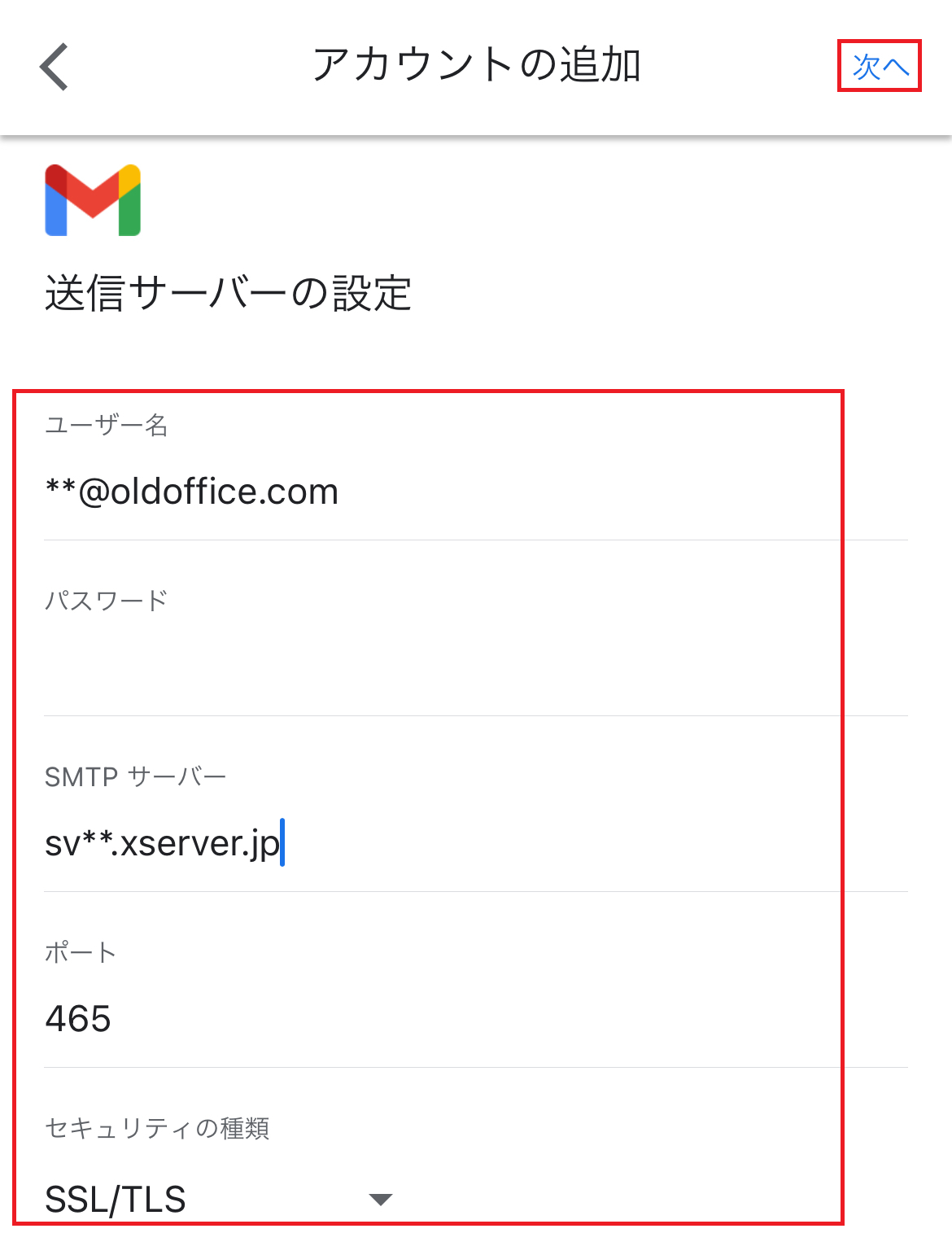 SMTPサーバー:別で送付している「メール設定情報」PDFを参照ください。