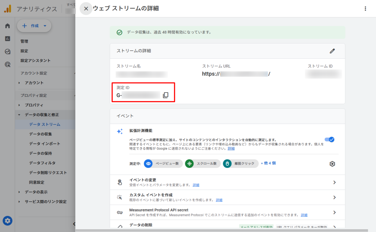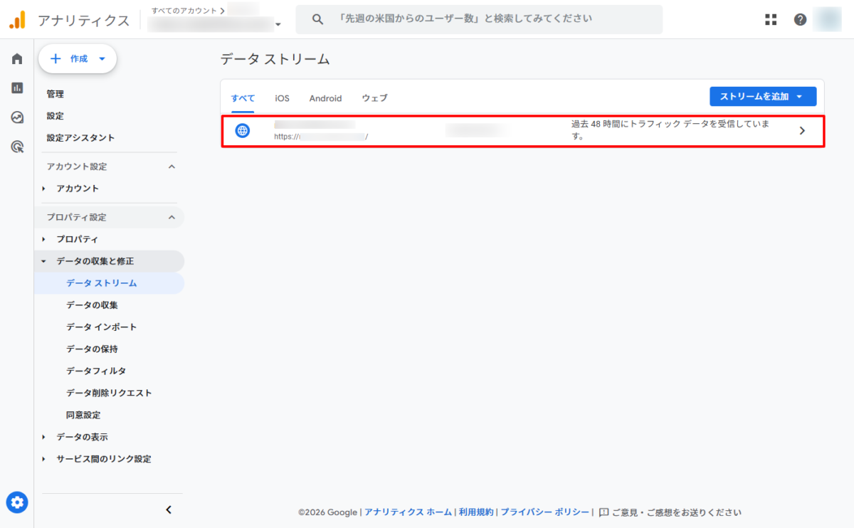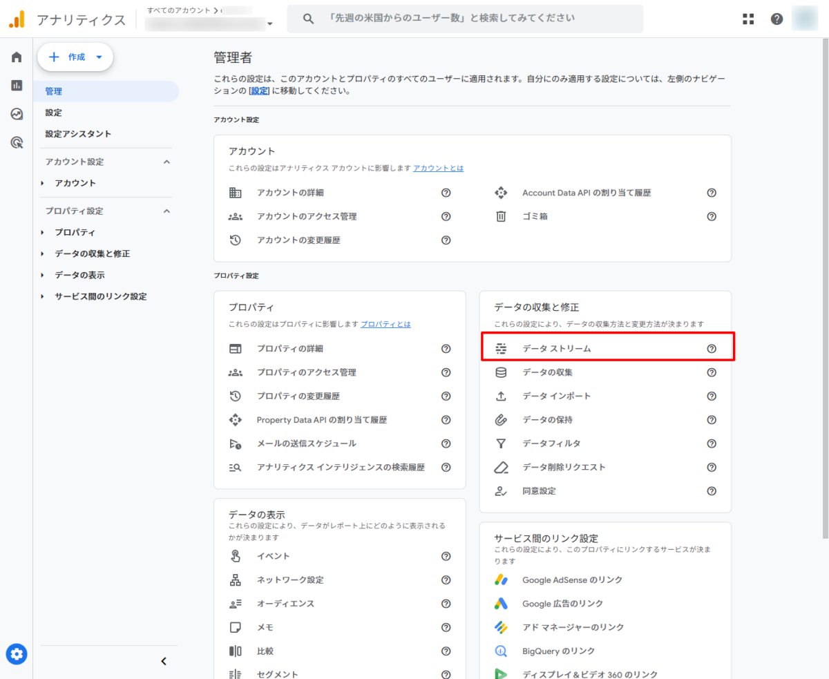 「データの収集と修正」のメニュー内にある[データストリーム]をクリックします。